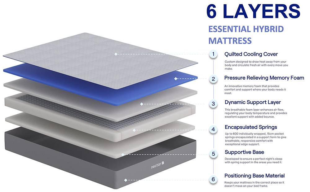 Six layers of life-changing comfort, the hybrid element of the mattress ensures memory foam works alongside encapsulated springs to create the ideal sleep surface.